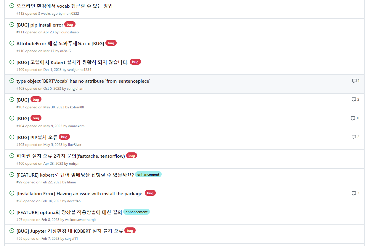 그래서 KoBERT라는 SKT에서 오픈소스로 제공해주는 것을 사용하고 자 했다. 그러나 KoBERT가 제대로 설치되지 않았고, 이를 해결하기 위해 서칭을 하기 시작했다. 이슈 페이지를 들어가보니, 2023년부터 이러한 이슈들이 계속 올라오고 있었는 데, 이미 지원을 멈춘 것인 지 이슈에 대한 응답은 없었다.