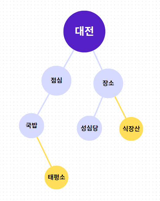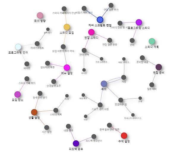 그리고 마인드맵으로 수정하며 또 다른 문제가 발생했는 데, 겹치는 키워드에 대해서 어떻게 처리할 것인가에 대한 것이었다. 이를 처음에는 키워드가 겹치기만 하면 기존의 키워드 하위에 노드가 생기도록 코드를 짰는 데, 오늘 점심 메뉴, 내일 점심 메뉴, 여행가서 먹을 점심 메뉴가 합쳐지는 문제가 생겼고 이를 해결하기 위해 메인 아이디어가 같은 뿌리를 갖고 있을 때만 노드를 뿌리도록 수정했다.
