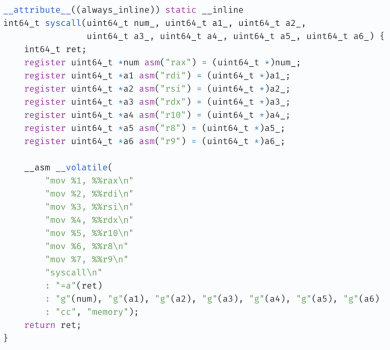 이 때 syscall 함수는 syscall을 호출하는 것이지 실제로 동작하는 함수는 아니라는 것에 유의해야합니다. 이렇게 syscall 함수를 호출하면 정수 레지스터에 인자들을 담아 전송하게 됩니다.