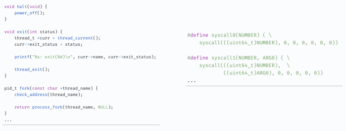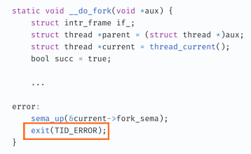 유저 함수에서 어떠한 동작을 하다가 system call을 호출하는 경우가 발생할 수 있습니다. Pintos에서는 저희가 유저 함수를 딱히 구현한 적이 없기 때문에 do fork 함수의 error 처리 부분으로 대체했습니다. 이런 식으로 system call 함수를 호출하게 되면 다음과 같이 syscall 함수로 인자들을 통째로 넘겨주게 됩니다.