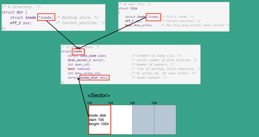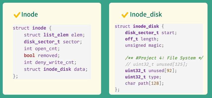 Inode란 파일이나 디렉토리에 대한 metadata를 가지고 있는 고유 식별자입니다. 파일과 디렉토리는 모두 inode를 갖고 있습니다. inode 구조체는 파일이나 디렉토리를 열 때 발생하는 inode_open() 함수를 실행하면 생성되며, 열리지 않았을 때는 inode_disk인 상태로 Disk에 저장되어 있습니다.