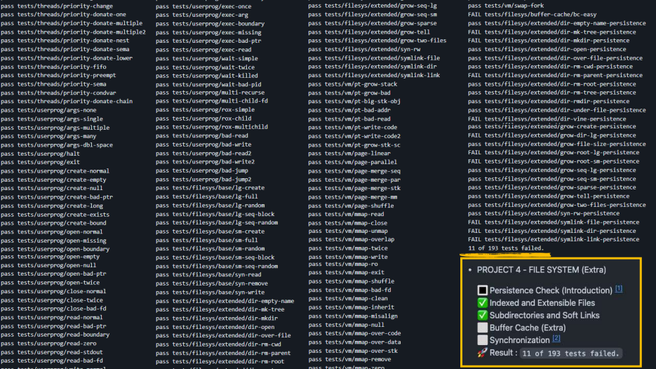 현재 Soft Link 까지 구현했고 Buffer Cache, 동기화, 지속성 테스트는 완료하지 못했습니다. 시간이 부족한게 안타까웠습니다. 현재 Test는 193개 중에 11개 남아 있는 상태입니다.