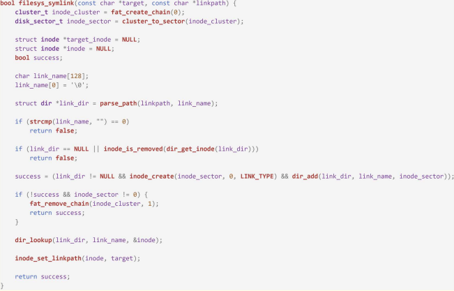 처음엔 link파일을 2중 포인터처럼 구현을 했었는데 이 기능을 구현하는게 너무 골치아파서 link에 그냥 원본 파일 name을 저장하여 lookup하도록 만들습니다. 이 기능 만드는 데도 20시간 정도 걸렸습니다. 은식님의 Tip이 없었다면 아마 더 걸렸을 것 같습니다.