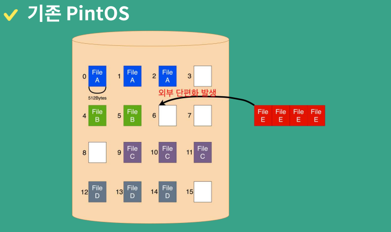 기존의 Pintos는 freemap을 사용한 형태로 디스크를 사용하고 있습니다. freemap은 bitmap이라고 이해하시면 됩니다. 그래서 기존의 파일 시스템은 그림과 같이 단편화가 발생해 있으면 Data가 들어갈 수 없습니다.