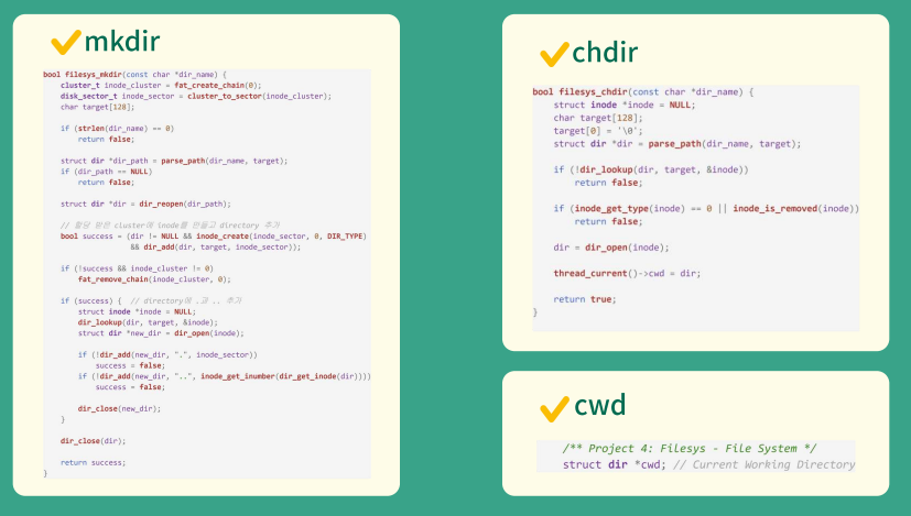 우리는 이를 여러개의 directory를 만들 수 있도록 수정할 수 있도록 구현해야 합니다. 이를 위해 mkdir이라는 디렉토리 생성 함수와 chdir이라는 현재 스레드가 작업중인 디렉토리의 위치를 변경하는 함수를 생성했습니다. 또한 현재 작업중인 디렉토리는 스레드에 종속되어야 하기 때문에 thread에 새로운 멤버를 추가해줬습니다.