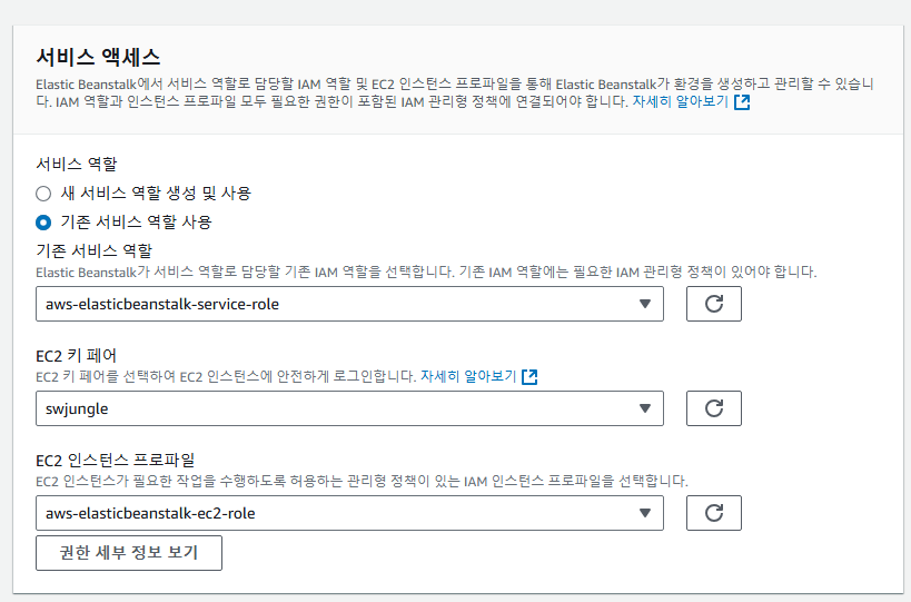 그 후 서비스 엑세스 구성을 정해주는 데, 3개 다 모두 지정해줘야한다. 필자의 경우에는 정글에서 사용하던 키페어가 있기 때문에 이를 그대로 사용했고, aws-elasticbeanstalk-service-role 서비스 역할과 aws-elasticbeanstalk-ec2-role 인스턴스 프로파일을 적용했다.
