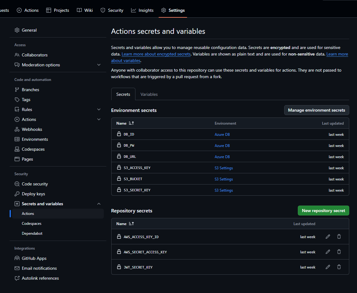 - secrets는 깃허브 액션에서 가져오는 비밀값인데, 이도 설정해줘야 한다.