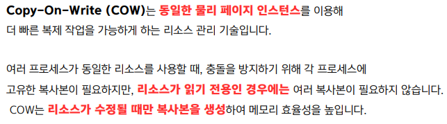 Project 3의 Extra 과제인 Copy on Write에 관해 알아보겠습니다. 먼저, Git book에서는 copy on write에 대해 다음과 같이 정의하고 있습니다. 그래서 fork를 할 때에는 새로운 물리 페이지를 할당하지 않고 부모와 같은 물리 페이지를 매핑만 해주었다가 추후에 write를 시도할 때에만 새로운 물리 페이지를 할당해 주면 되는 것입니다. 우리는 filebacked Page의 경우에 이미 같은 물리 메모리를 공유하도록 구현했기 때문에 여기서 힌트를 얻을 수 있었습니다. 기존에 우리 프로그램은 이 페이지가 작성가능한지만을 검사하고 있었습니다. 그런데 이 페이지가 원래 부모 프로세스가 만들어 놓은 Anonymous Page이고 fork된 프로세스에서 write 하려고 한다면 ..